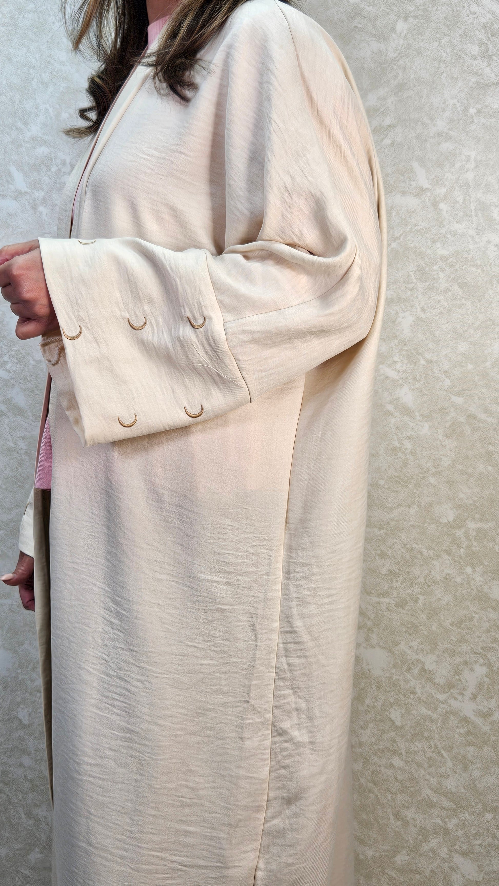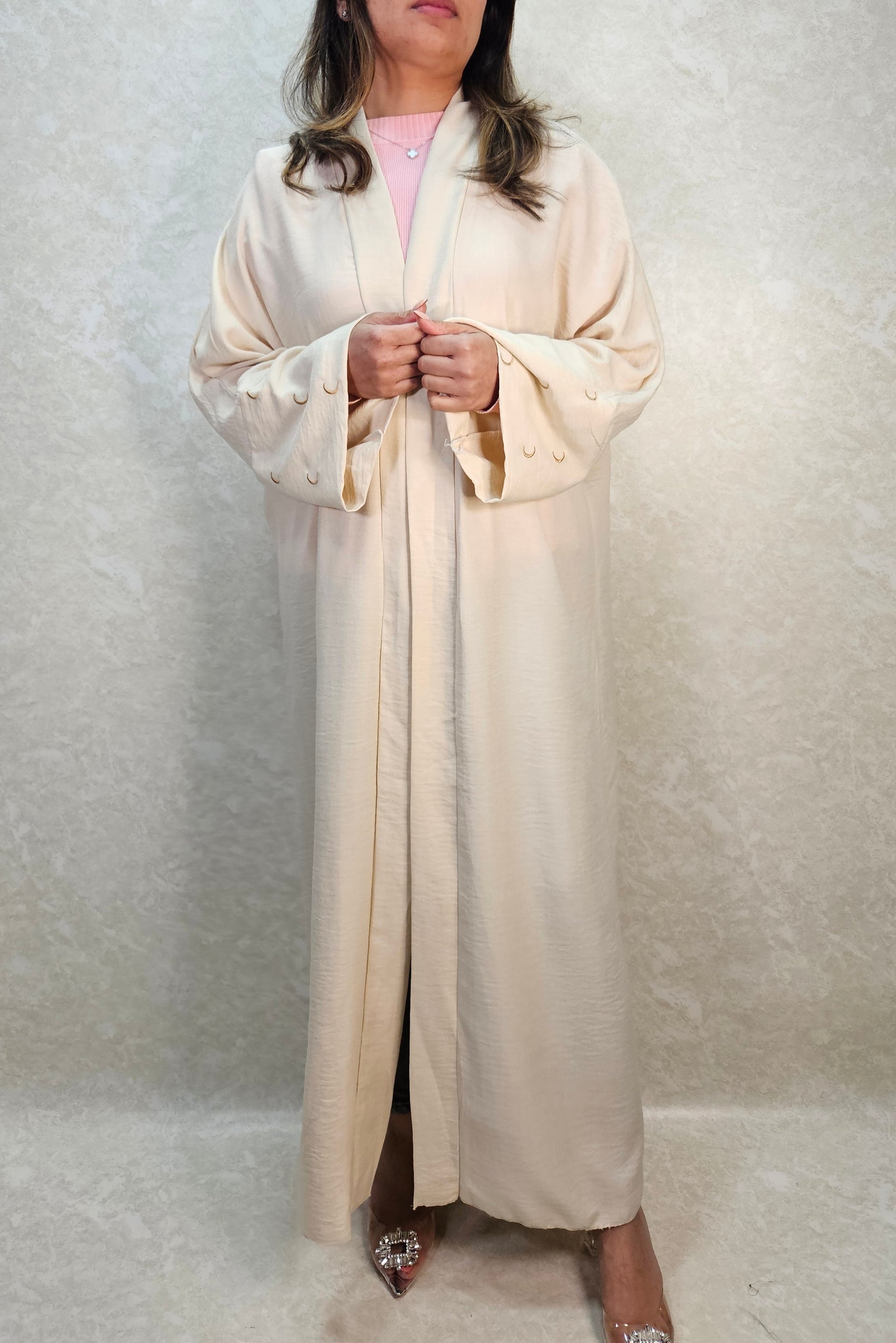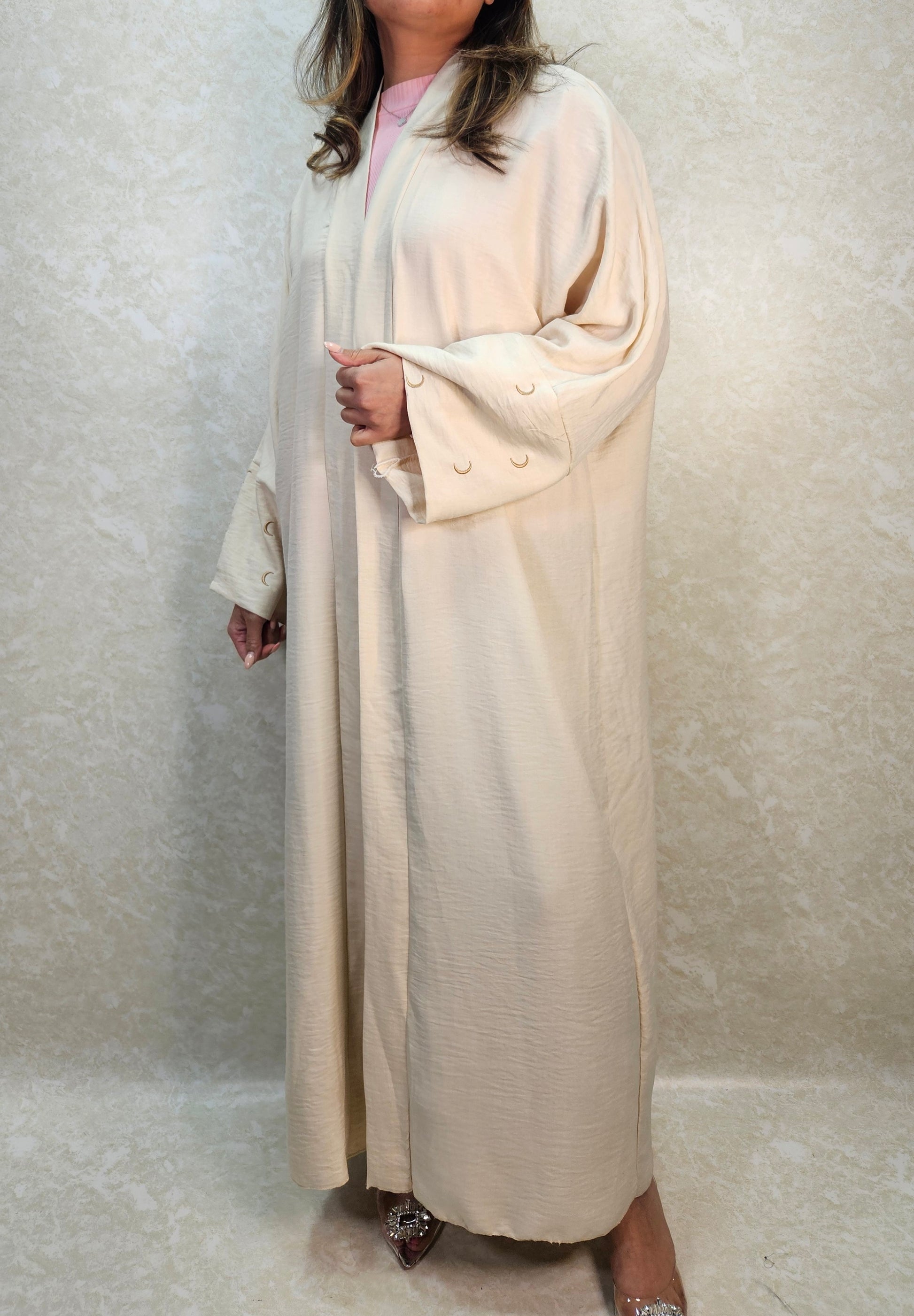 CHAND KIMONO ABAYA is a must-have for Ramadan. Its Chand detailed sleeves and open kimono design add a touch of elegance, while the soft material ensures comfort.